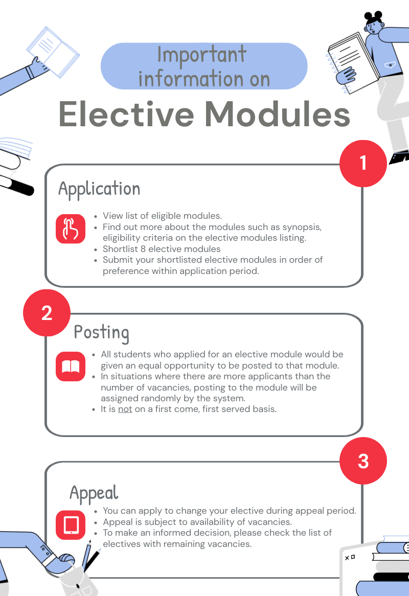 - Depending on your course, you may start your electives in Year 1, Semester 2 of your studies, or in Year 2.