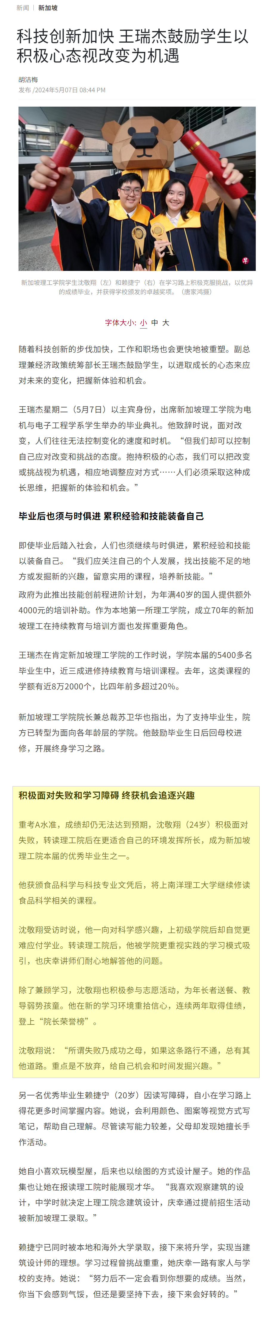 Lianhe Zaobao, 7 May 2024 - Diploma in Food Science & Technology graduand, Nicholas Sim, decided to enter SP due to the hands-on learning that it provides. He eventually excelled in his studies.