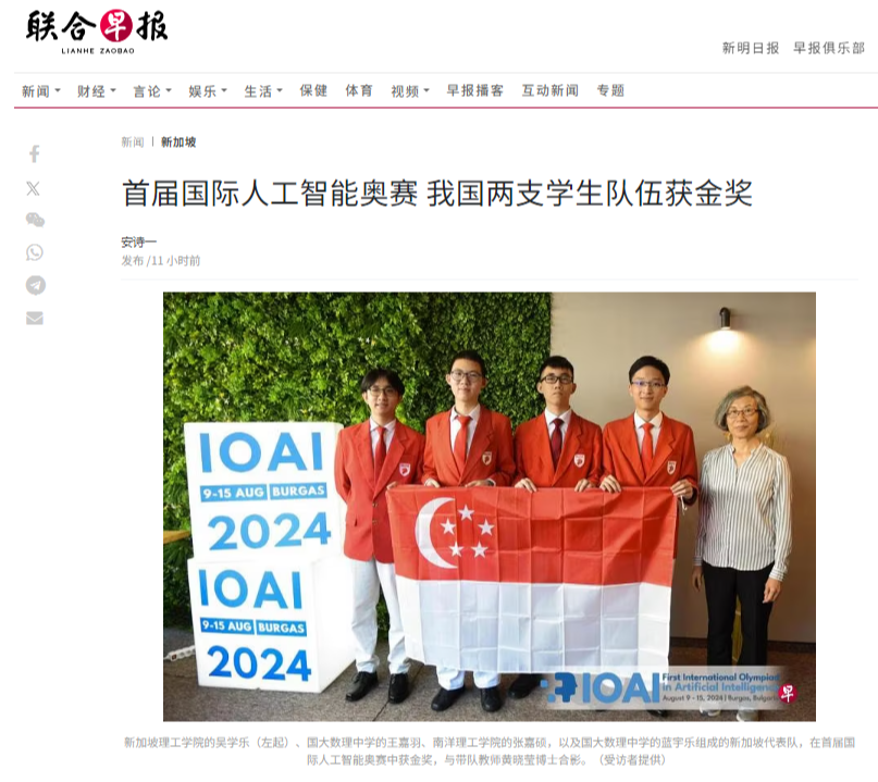 Lianhe Zaobao, 20 August 2024 - - The first International Artificial Intelligence Olympiad was held from 9 to 15 August in Burgas, Bulgaria. The competition focused on knowledge in Science, Technology, Engineering, and Mathematics (STEM), and was divided into two segments: scientific and practical. In the scientific segment, participants were tested on their knowledge of artificial intelligence, competing in areas like Natural Language Processing (NLP), machine learning, and computer vision using real-world datasets. Singapore fielded eight students from two teams which included Zhang Jia Shuo, a third-year student in the Diploma in Artificial Intelligence and Data Engineering at NYP; Lan Ning Le, a sophomore at NUS High School; Wang Jia Yu, a freshman at NUS High School; and Glenn Wu (吴学乐), a third-year student in the Diploma in Applied AI & Analytics (DAAA) at SP. The Singaporean teams won two out of the four gold medals in the scientific competition. The other two teams that won gold medals were from schools in Poland and Russia.