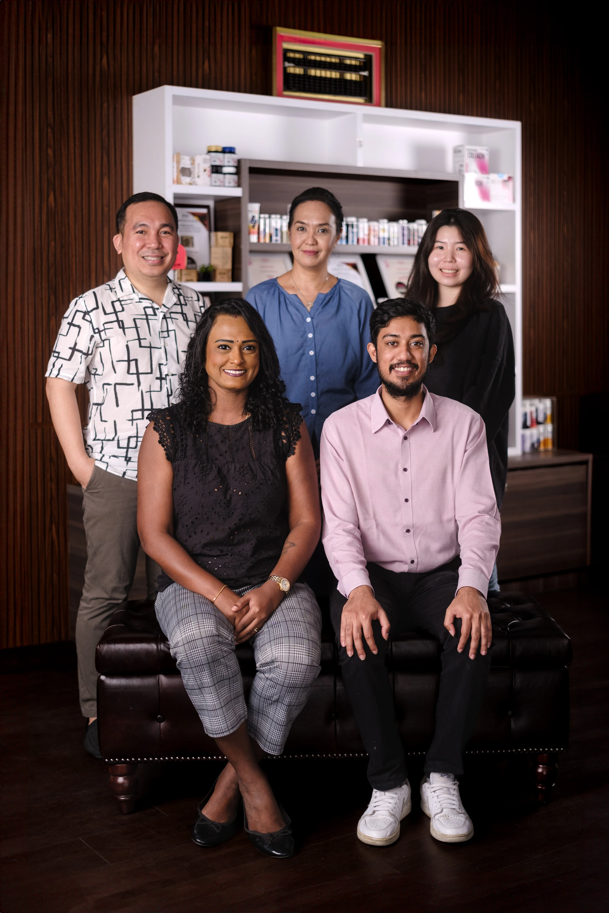 Ms Logeswari, Mr Sanjay, and their colleagues (standing, from left) Nino Babago, Diane Khalid, and Chan Hui Xin are proud to launch Herbal Pharm’s first haircare line.