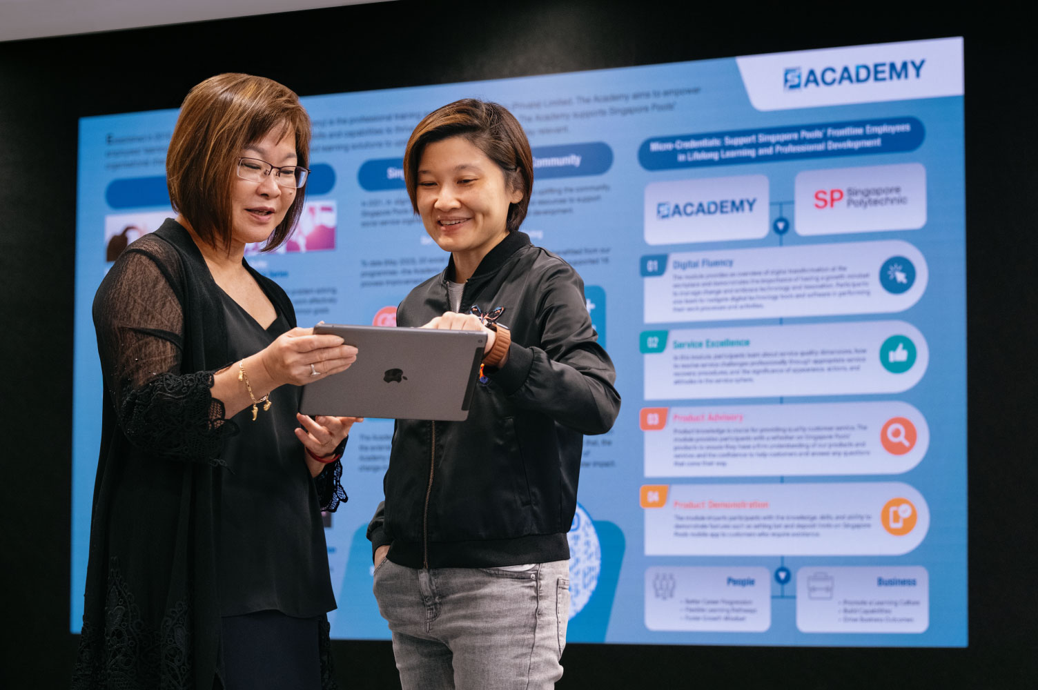 Ms Evelyn Goh, Senior Director at Singapore Pools Academy discussing details around the Certified Service Professional (CSP) programme with her colleague, Ms Jene Chu, Programme Manager at Singapore Pools Academy.