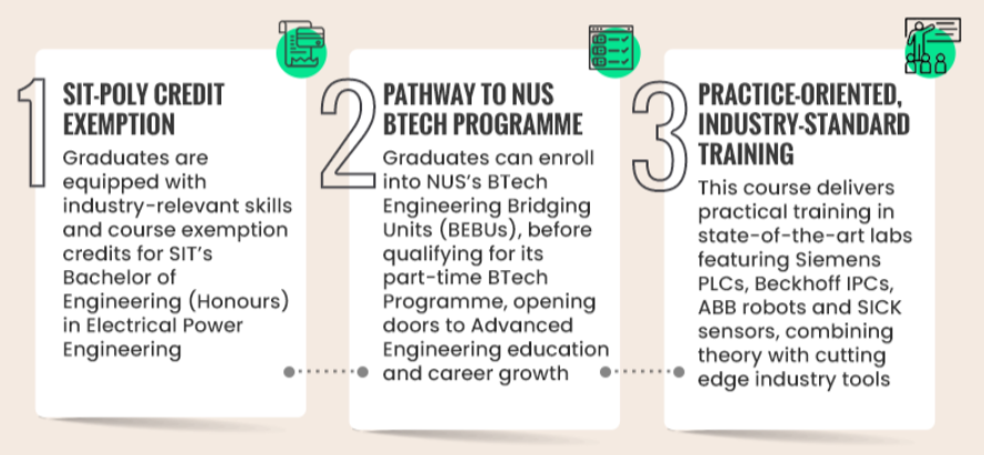 Stand out with your achievements:Participants who score a minimum grade of A in the following modules will be eligible for credit exemptions towards the Bachelor of Engineering with Honours in Electrical Power Engineering at SIT: