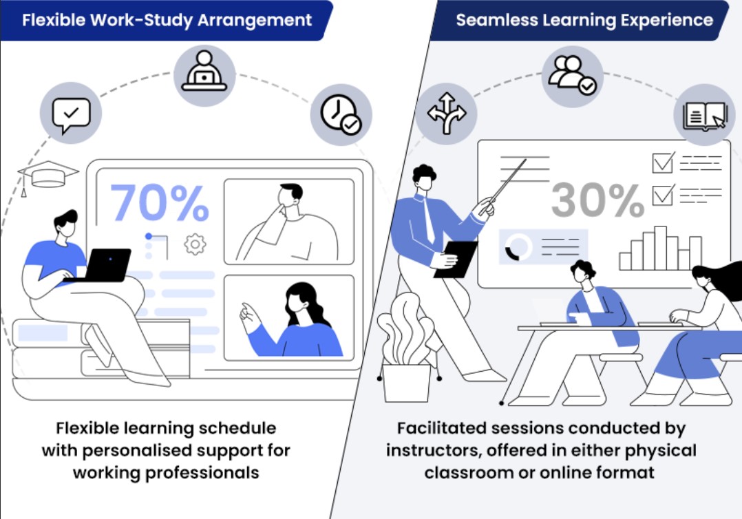 The remaining 30% of the course would be conducted either onsite at our campus or online. All these aspects make our course an ideal choice for working adults who value flexibility, quality, and innovation in their education.
