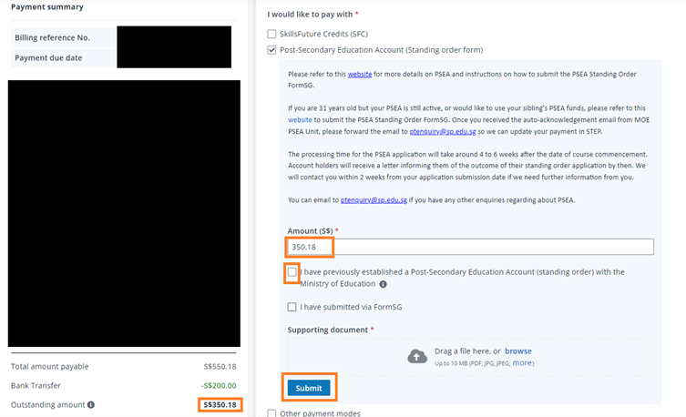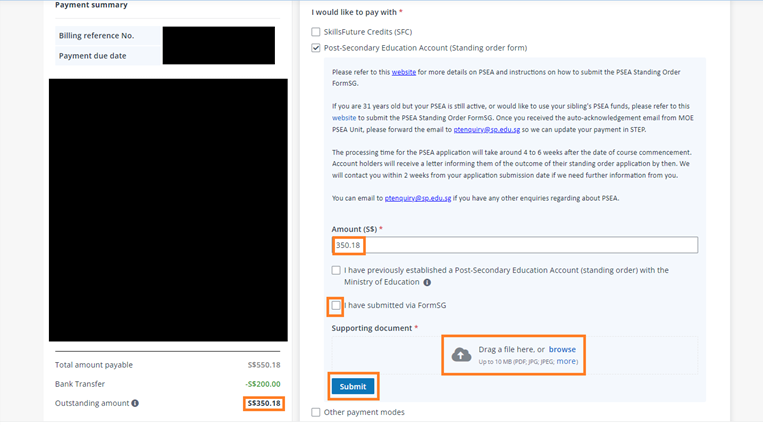 | Subsequent submissions | - To declare that you will be using your PSEA/your siblings’ funds, login to STEP Student Portal > Task > Pay and choose “Post-Secondary Education Account (Standing Order form).”